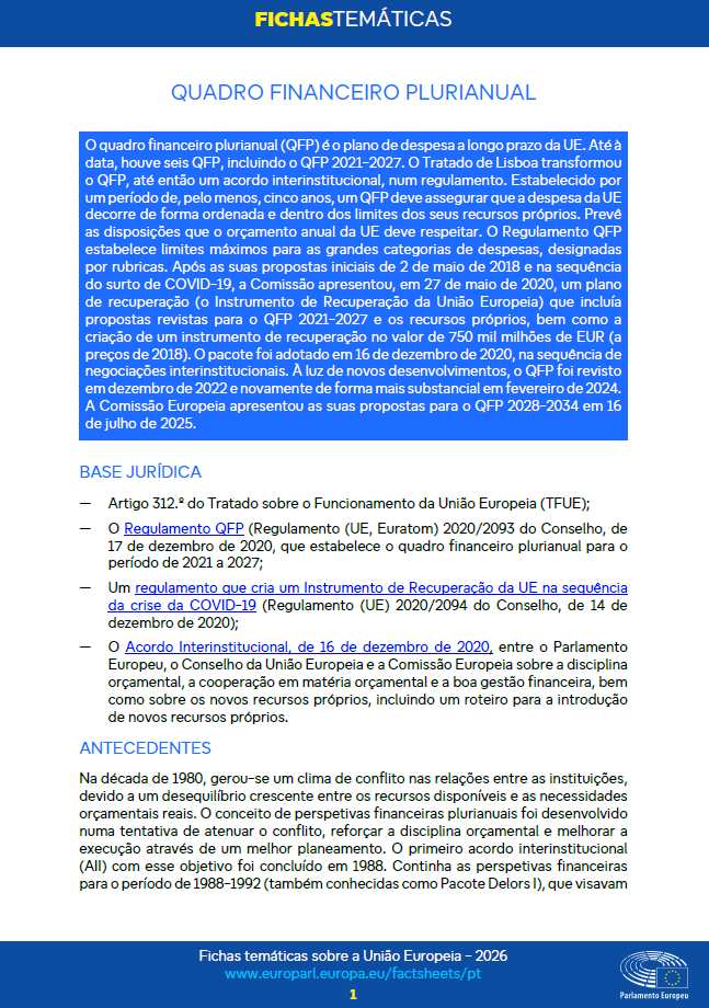 O Tratado de Lisboa transformou o QFP de um acordo interinstitucional num regulamento. Estabelecido por um período de pelo menos cinco anos, o QFP garante que as despesas da UE se desenvolvam de forma ordenada e dentro dos limites de seus próprios recursos. Estabelece disposições com as quais o orçamento anual da UE deve estar em conformidade. O Regulamento do QFP estabelece tetos de gastos para categorias amplas chamadas títulos.